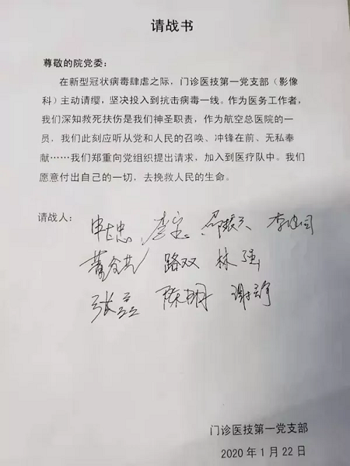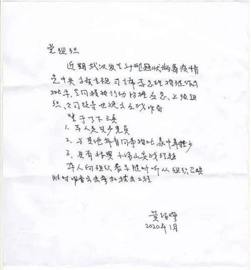 年近八旬的黄锡璆博士,还第一时间向组织递交了请战书,表达了作为共产党员、愿随时听从组织安排,赶赴一线,参加疫情抗击工作的决心。他写道:“本人是共产党员,与其他年青同事相比家中牵挂少,具有非典小汤山实战经验。本人向组织表示,随时听从组织召唤,随时准备突击参加抗击工作。”