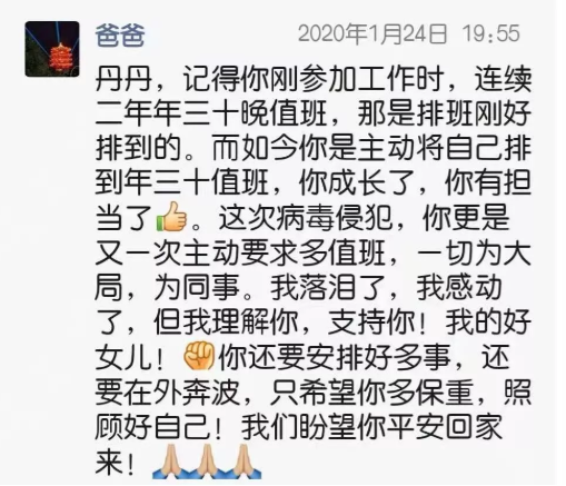 刘海生在微信群里发过这样一段感言:“老婆和孩子春节都在医院参加抗战疫情,心里压力好大!给自已和家人默默的鼓个劲,加个油。我们一定会平安的渡过疫情危机,抗战一定会取得胜利!祝家人安好,祝同学们安好,祝全国人民安好!对抗疫情!”