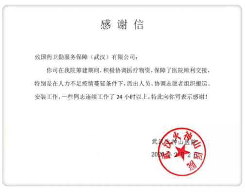 武汉火神山医院亦对于国药卫勤志愿者团队表达了感谢!