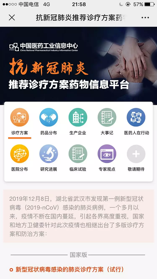 及时上线“抗新冠肺炎推荐诊疗方案药物信息平台”。国药医工总院下属企业中国医药工业信息中心放弃春节休假、积极组织人员加班加点协助工信部消费品工业司和多省工信厅查询各类医用物资相关信息,并紧急联系多家医药企业,为国家应急供应保障提供支持。同时他们还用急行军速度,于1月底紧急上线“抗新冠肺炎推荐诊疗方案药物信息平台”,该平台共分诊疗方案、药品分布、生产企业、医药人在行动、医院分布、研究进展、大事记和专家观点等版块。特别是药品分布和生产企业板块,充分利用了中国医药工业信息中心医药行业大数据平台的优势,汇总了诊疗方案推荐的所有品种在全国的区域分布、商品名、企业、剂型、规格和批准文号等信息,将为各地查询抗新冠肺炎药品来源提供数据支持。