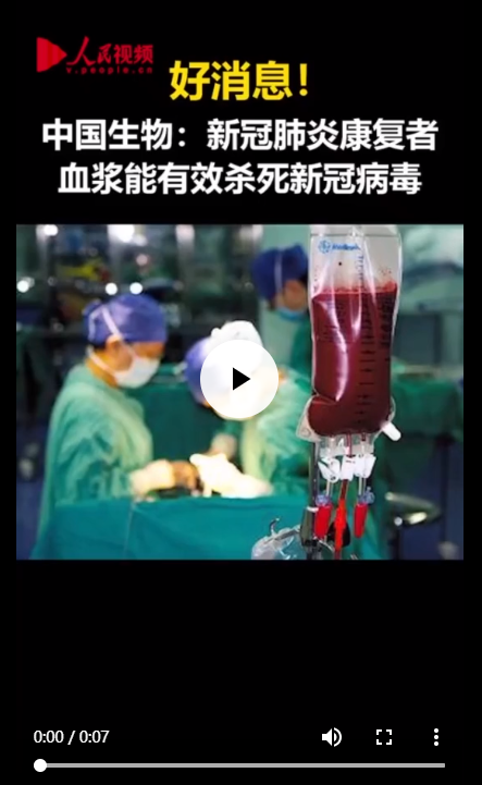 中国生物称,在目前缺乏疫苗和特效药的前提下,新冠肺炎康复者恢复期的血浆是临床特异性治疗最可及的资源。