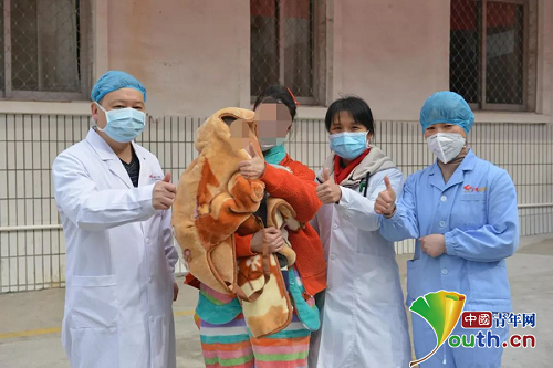 患儿妈妈已于2月8日治愈,为了照顾孩子一直没有离开隔离病区,当天终于盼来宝宝治愈的好消息,母女俩一同出院回家。目前患儿爸爸仍在积极治疗中。
