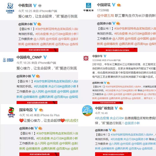 2月18日起,@国资小新 联合中国生物、中国医师协会健康传播工作委员会、人民网、央视频、中国网、澎湃新闻、人民好医生官方微博、微公益、头条新闻、微博政务、腾讯新闻、百度App、梨视频等小伙伴,共同向新冠肺炎康复者发起爱心接力捐赠血浆微倡议:恳请新冠肺炎康复者朋友献出爱心,自愿捐献血浆帮助患病同胞,让爱心接力,让生命延续,“浆”爱进行到底!