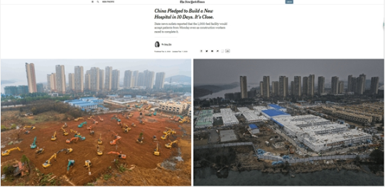 国际主流媒体高度关注中国企业“超高速”建设应急医院,已相继交付使用的武汉火神山和雷神山两所“小汤山模式”医院成为报道热点。