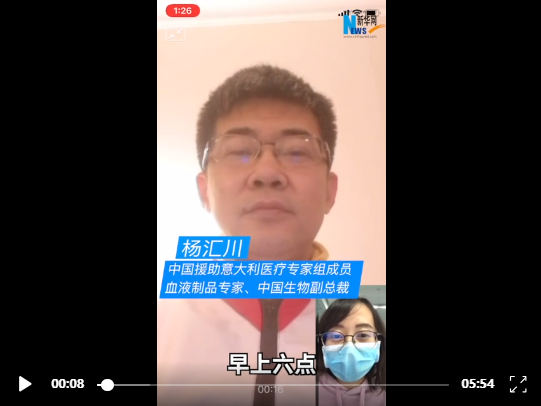 “我这次来的主要任务是分享康复者血浆应用于临床危重病人治疗的经验,意大利的采供血机构是比较完善的,现在也有了一千多位康复病人,采浆工作应该能有一定的基础。在采集血浆的安全性和有效性,以及临床怎样应用能够取得更好的治疗效果方面我们都将和意大利的同行进行充分的沟通和交流。”杨汇川说。
