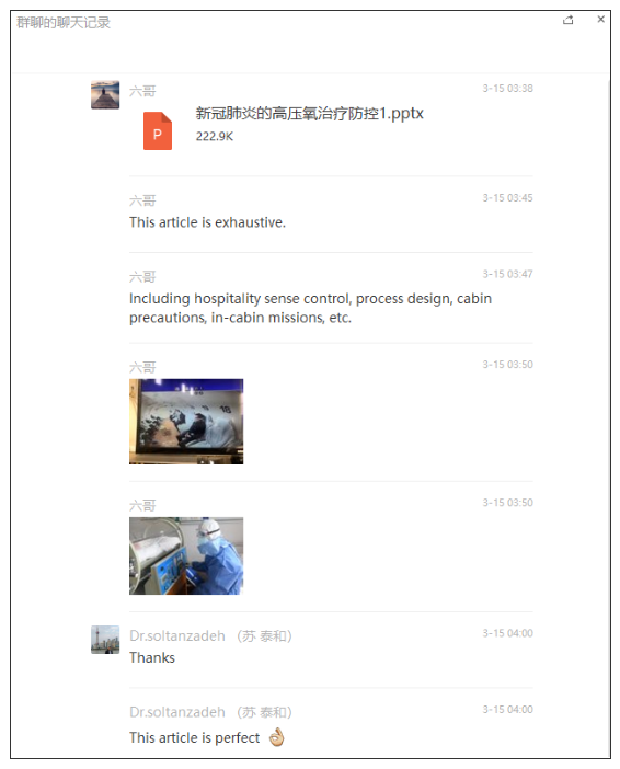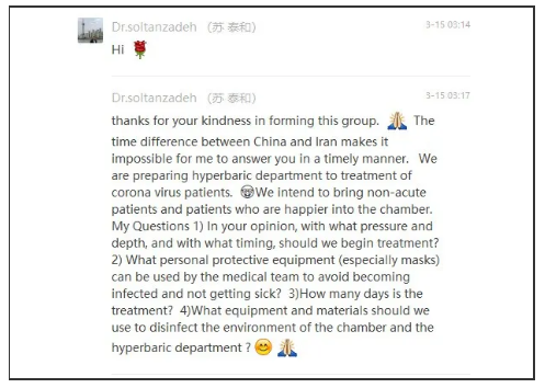 3月14日上午10点,曾在第二军医大学留学的伊朗医生Dr.soltanzadeh(苏泰和)通过他的中国老师——潜水医学系的刘教授与贺聪取得联系,向国药东风总医院请教高压氧治疗新冠肺炎患者的防控措施和治疗方案。