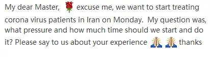“亲爱的老师,打扰了,我们想周一开始治疗伊朗的新冠肺炎患者。我的问题是,我们应该使用多大压力,每次治疗吸氧多长时间?请告诉我你们的经验。谢谢” 。