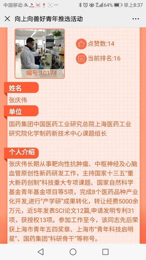 请行动起来,投出您的一票,为您身边的好青年国药医工总院张庆伟加油!
