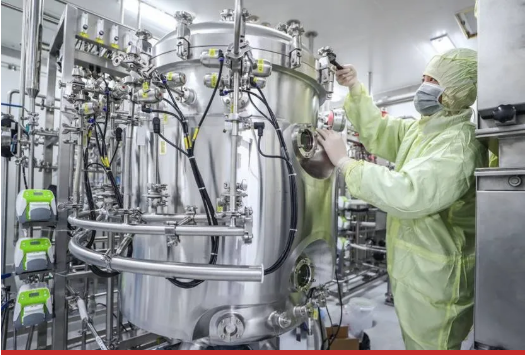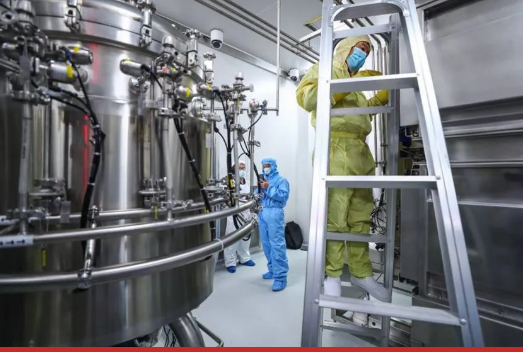 ↑4月10日,工作人员在果冻传媒 中国生物新冠疫苗生产基地尚未投产的新型冠状病毒灭活疫苗生产车间内调试设备。