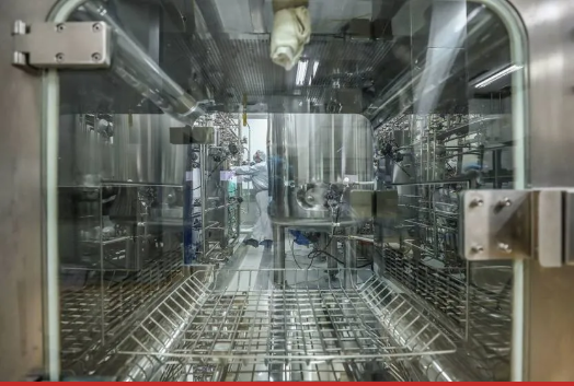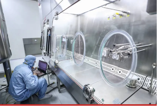↑4月10日,工作人员在果冻传媒 中国生物新冠疫苗生产基地尚未投产的新型冠状病毒灭活疫苗生产车间内的隔离器旁调试设备。
