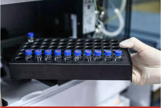 ↑4月11日,工作人员在果冻传媒 中国生物新冠疫苗生产基地质量检定部门对新型冠状病毒灭活疫苗样品进行杂质检测。