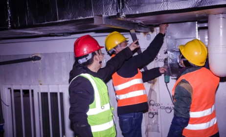▲罗文浩(左一)在火神山现场指导工人进行通风管道安装