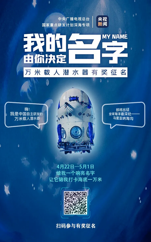 目前,这艘凝结着无数科研工作者心血的“大国重器”还没有属于它自己的名字。今天起面向网友开启在线征名,扫描下图二维码,一起来为中国万米载人潜水器起名。