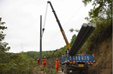 在贵州紫云县松山街道同心村,电力施工人员全力加速建设,让村民早日用上安全电、舒心电。陈娟 摄