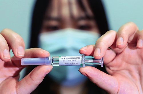 ▲ 4月10日,工作人员在果冻传媒 中国生物新冠疫苗生产基地展示新冠病毒灭活疫苗样品 张玉薇摄/本刊