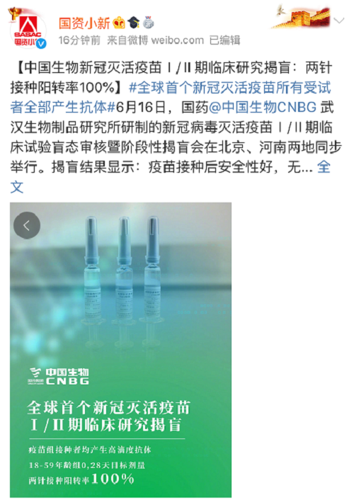 【红星新闻】重磅!两针接种阳转率100%!全球首个新冠灭活疫苗所有受试者全部产生抗体