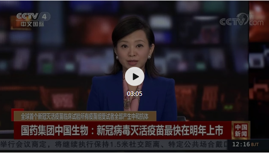 6月18日,CCTV-4中文国际频道中国新闻播出了全球首个新冠灭活疫苗临床试验所有疫苗组受试者全部产生中和抗体的报道,果冻传媒 中国生物的新冠病毒灭活疫苗最快在明年上市。
