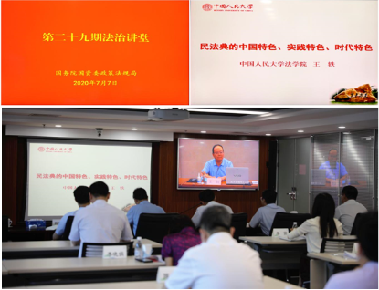 与会人员集体收看了中国人民大学法学院党委书记、院长王轶教授题为《民法典的中国特色、实践特色、时代特色》的专题讲座。王轶教授从“坚强有力的政治保障”、“足够丰富的法律实践”、“价值共识的凝聚能力”、“比较充分的理论准备”等方面对民法典的制订过程和特点进行了深入阐释,帮助大家充分认识颁布实施民法典重大意义,提升学法尊法守法用法意识。