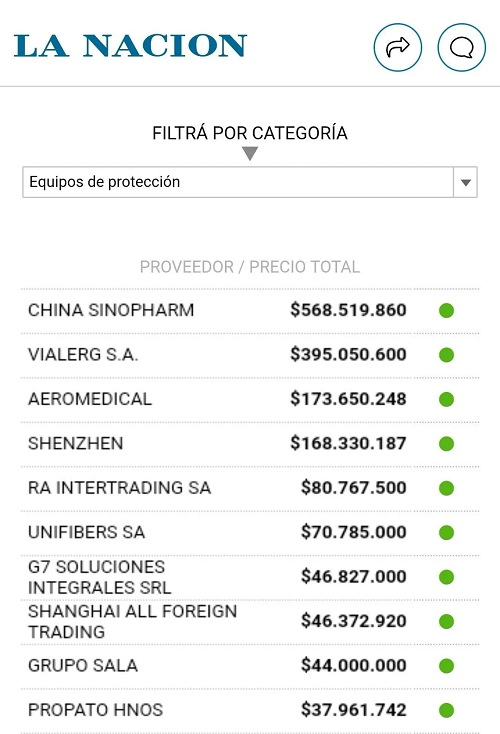近日,阿根廷《国家报》发布了一份向阿根廷政府提供抗击新冠疫情医疗产品的供应商名单,果冻传媒 国药国际在个人防护用品类产品全球供应商中位列榜首。此前,国药国际已向阿根廷供应了300万个医用外科口罩、30万件医用一次性防护服等抗疫物资。截至7月4日,14个批次的物资已分别搭乘专机全部运抵阿根廷首都布宜诺斯艾利斯。