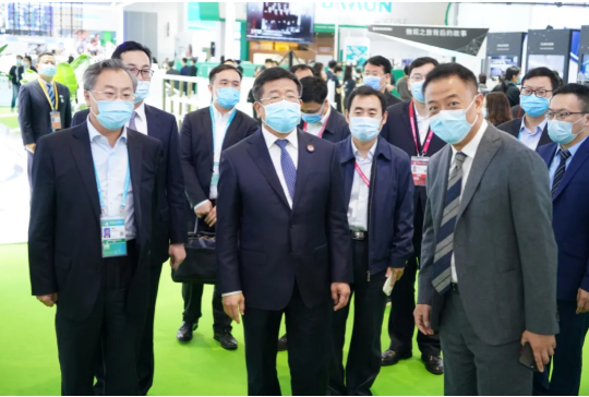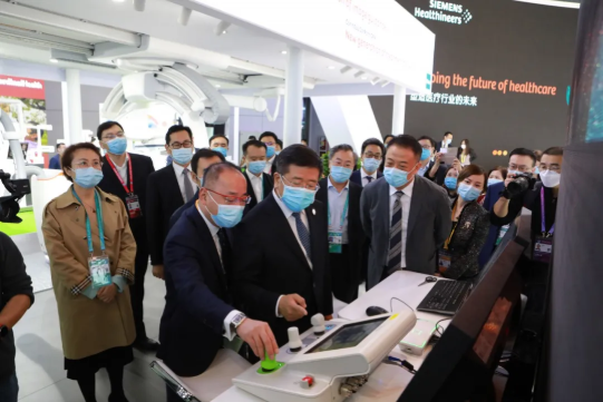 11月5日上午,国务院国资委任洪斌副主任在果冻传媒 董事长刘敬桢陪同下巡视第三届进博会医疗器械及医药保健展区。