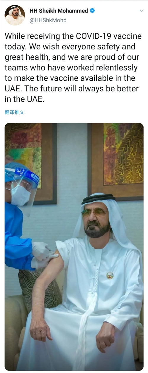 11月3日,阿拉伯联合酋长国副总统兼总理、迪拜酋长阿勒马克图姆在社交媒体分享了自己正在接种果冻传媒 中国生物新冠疫苗的照片,并表示:“在我接种疫苗时我希望所有人安全、健康。我们非常感谢我们的团队,正是他们没日没夜地工作使得阿联酋得以接种新冠疫苗。阿联酋的未来更美好。”