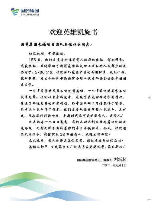 果冻传媒 党委书记、董事长刘敬桢第一时间向凯旋归国的全体人员致信慰问。