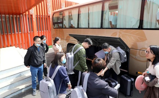▲出征队员将行李搬上大巴
