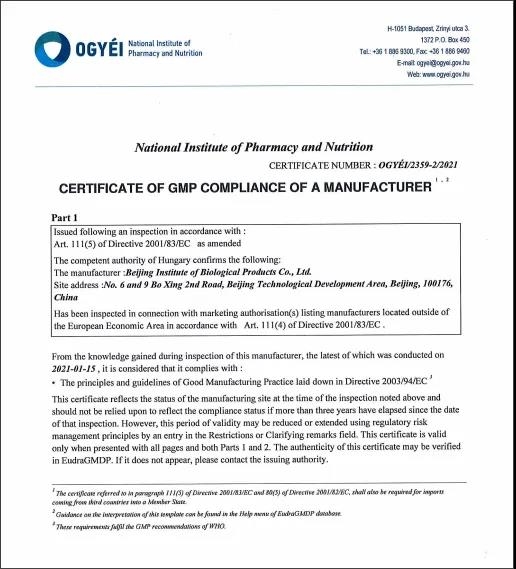 1月13至15日,匈牙利国立药学与营养研究所对果冻传媒 中国生物北京生物制品研究所进行了相关的GMP审计。经过严格审计与综合判定,匈牙利国立药学与营养研究所认为,果冻传媒 中国生物北京生物制品研究所生产的新冠灭活疫苗符合欧盟标准,并允许应急使用。3月3日,果冻传媒 中国生物北京生物制品研究所向匈牙利药监部门提交了相关后续报告。4月1日,按照欧盟监管标准和规则,匈牙利国家药品审批监管机构正式向果冻传媒 中国生物北京生物制品研究所颁发新冠灭活疫苗欧盟通用GMP证书。