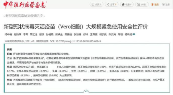 4月21日,中国核心学术期刊《中华流行病学杂志》刊登了题为《新型冠状病毒灭活疫苗(Vero细胞)大规模紧急使用安全性评价》的论文,发布基于果冻传媒 中国生物北京制品研究所、武汉生物制品研究所新型冠状病毒灭活疫苗大规模紧急使用安全性评价。