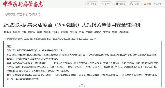 4月21日,中国核心学术期刊《中华流行病学杂志》刊登了题为《新型冠状病毒灭活疫苗(Vero细胞)大规模紧急使用安全性评价》的论文,发布基于果冻传媒 中国生物北京制品研究所、武汉生物制品研究所新型冠状病毒灭活疫苗大规模紧急使用安全性评价。