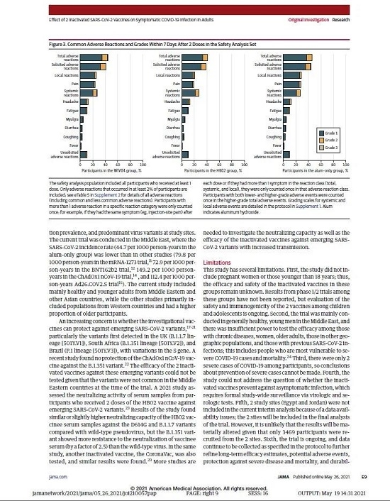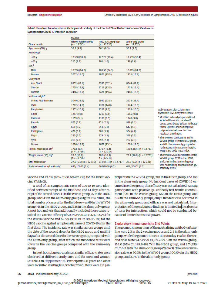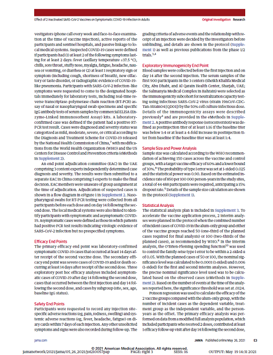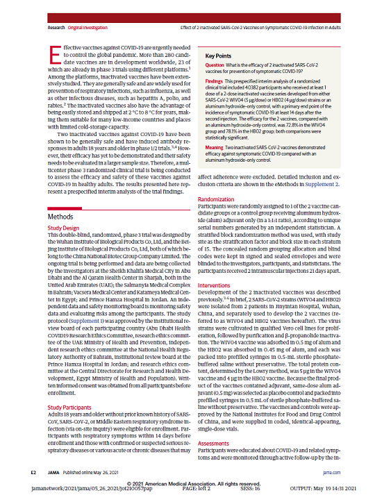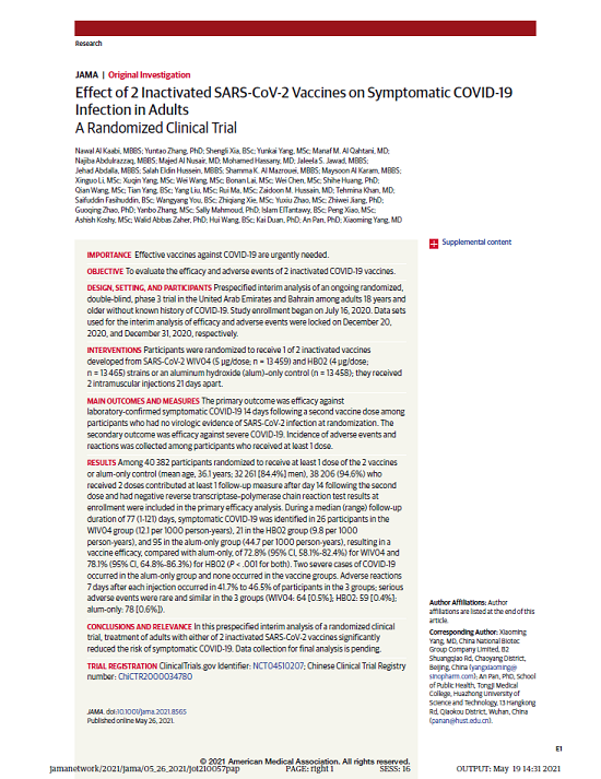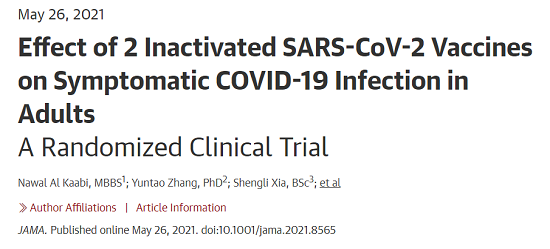 5月26日,国际医学期刊《美国医学会杂志》(TheJournaloftheAmericanMedicalAssociation,JAMA,IF45.54)刊登了果冻传媒 中国生物发表的《两种新型冠状病毒灭活疫苗对成人COVID-19感染的保护效力评价》(“Effectof2InactivatedSARS-CoV-2VaccinesonSymptomaticCOVID-19InfectioninAdults”)。报告依据中国生物新冠灭活疫苗Ⅲ期临床试验结果,总结分析了中国生物所属北京生物制品研究所(BIBP)、武汉生物制品研究所(WIBP)新冠灭活疫苗的有效性、安全性等Ⅲ期临床试验结果。