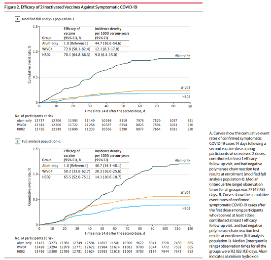 本项研究结果针对中国生物两款新冠灭活疫苗随机、双盲、安慰剂对照的Ⅲ期临床试验开展的中期分析。自2020年7月16日起,40411名受试者入组并随机分为三组,分别为铝佐剂组、新冠疫苗WIV04组和新冠疫苗HB02组。受试者在第0天和第21天接受两次肌肉注射。自第二剂接种后14天,累计确诊142例有效病例(铝佐剂组95例,WIV04组26例,HB02组21例),两种疫苗组有效率分别为72.8%和78.1%(均P<.001)。铝佐剂组出现2例重症病例,两个疫苗组均未出现重症病例。接种后7天总不良反应发生率在铝佐剂组为46.5%,WIV04组为44.2%,HB02组为41.7%。严重不良事件在三组无显著性差异。在两个疫苗组中血清阳转率均高于99.0%(与基线相比中和抗体滴度至少增加4倍),而在铝佐剂组中为2.3%。目前,该研究仍在进行中,长期保护性和安全性仍在评估中。