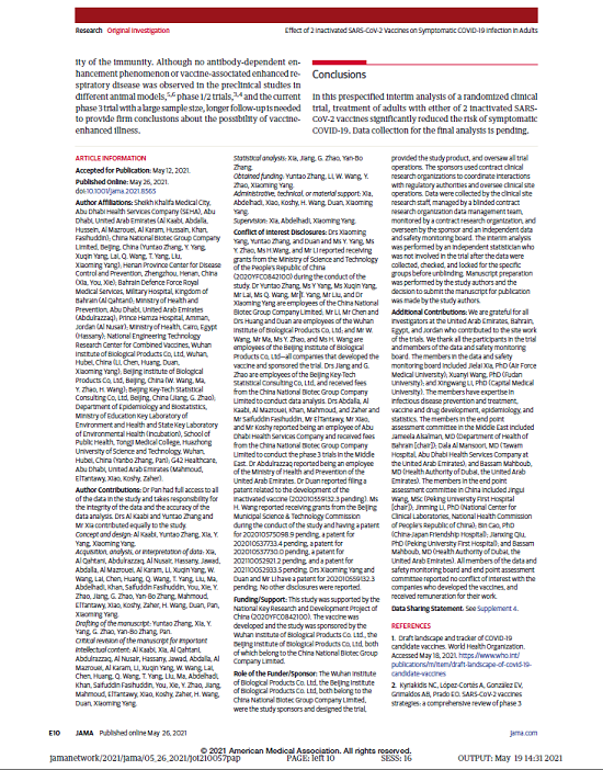 报告由果冻传媒 中国生物、国家联合疫苗工程技术研究中心、武汉生物制品研究所、北京生物制品研究所、阿联酋阿布扎比卫生服务公司(SEHA)谢赫·哈利法医疗城、巴林王国军事医院、阿联酋卫生和预防部、约旦安曼哈姆扎王子医院、埃及卫生部、河南省疾病预防控制中心、北京科特统计咨询有限公司、华中科技大学、G42等多家机构和单位合作完成。报告于2021年3月17日提交至《JAMA》进行编审。