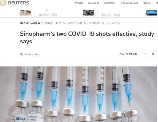 另据美国彭博社报道,发表在美国著名医学杂志上的一项研究显示,中国的国药疫苗能够成功遏制新冠肺炎,这是科学文献中首次出现中国疫苗后期试验的详细结果。
