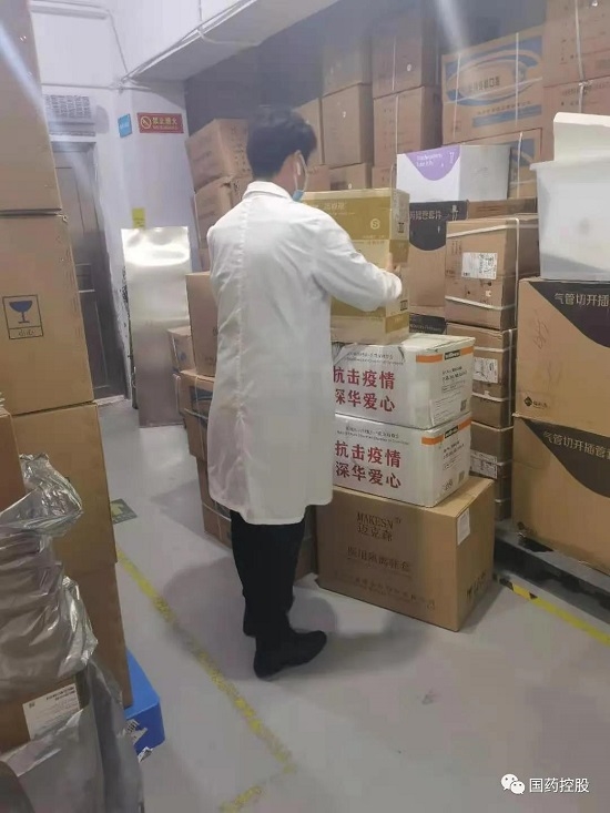 国控广东物流全体员工坚守岗位,克服连日的暴雨,衣服湿了干,干了湿,每日加班加点核算、搬运、分拣、转运配送,随时随地做好准备,确保医院、药店等发出需求的第一时间快速响应。