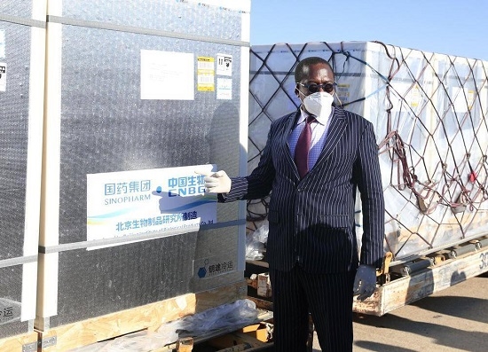 图为6月26日,津巴布韦财政部长恩库贝在首都哈拉雷的罗伯特·穆加贝国际机场迎接从中国采购的国药新冠疫苗。新华社发(肖恩·朱萨摄)