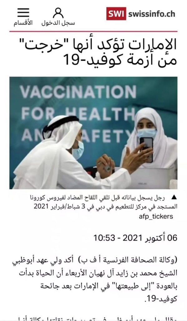 阿联酋是为其居民开展密集和快速疫苗接种的国家之一,接种了2000万剂疫苗,而人口则为1000万。