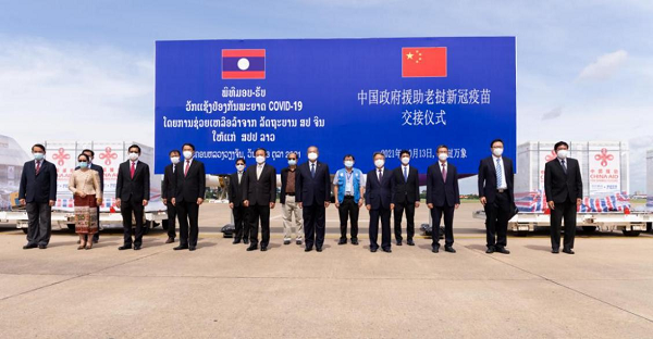 当地时间10月13日,中国政府援助老挝的第六批国药新冠疫苗运抵万象瓦岱国际机场。老挝人民革命党中央政治局委员、政府副总理、新冠疫情防控委员会主任吉乔,卫生部长本贡,以及中国驻老挝大使姜再冬等人到场迎接。