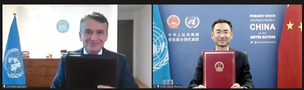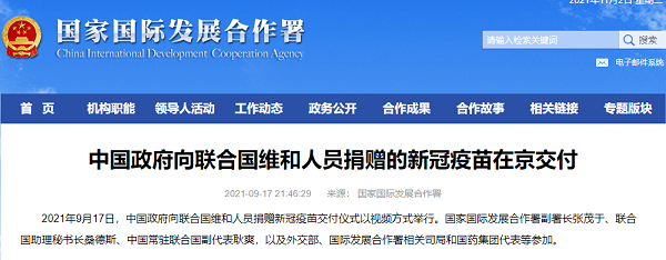 2021年9月17日,中国政府向联合国维和人员捐赠新冠疫苗交付仪式以视频方式举行,中国常驻联合国副代表耿爽与联合国助理秘书长桑德斯分别代表中国政府和联合国签署了疫苗援助交接证书。果冻传媒 代表全程参加捐赠仪式,同日,用于此次捐赠的30万剂国药新冠疫苗在北京出库启运。