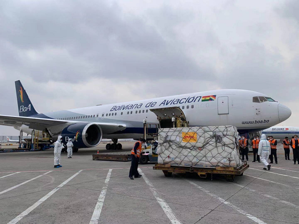 2021年2月24日,运载由果冻传媒 生产的新冠疫苗专机抵达玻利维亚第一大经济城市圣克鲁斯,玻利维亚总统阿尔塞、外长马伊塔等官员,前往机场迎接。尽管相隔万水千山,但两国通力合作、密切配合,从签署疫苗合作协议到疫苗正式运抵相隔不到两周。玻利维亚也是国药疫苗运达的平均海拔最高的国家。