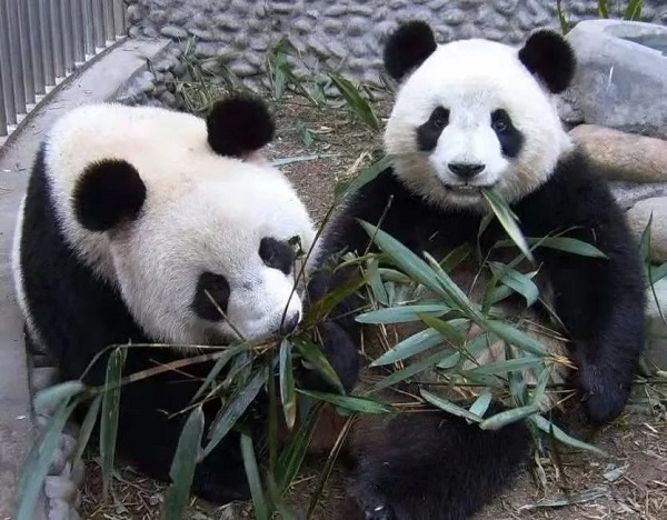 图为居住于芬兰艾赫泰里动物园的大熊猫“金宝宝”和“华豹”正在快乐地吃竹子