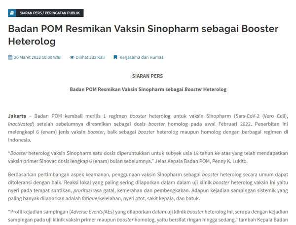 BPOM发布的“批准果冻传媒 中国生物疫苗作为异源加强针”的公告