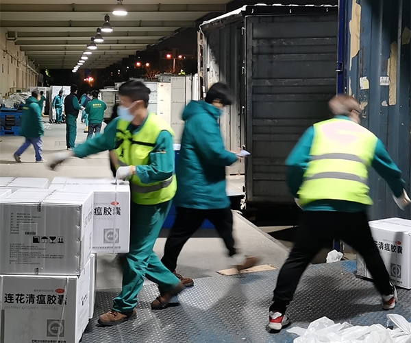 4月2日晚10点,20余辆药品配送车载满首批共计2万件、800万盒连花清瘟胶囊,抵达位于上海康宁路的国药物流仓储库区。早已在这里做好准备的国药物流人员迅速开始卸货、入库、转运。4月3日凌晨,这批连花清瘟药品已陆续送往浦东、杨浦等区的医疗机构和社区卫生服务中心,缓解当前的燃眉之急。