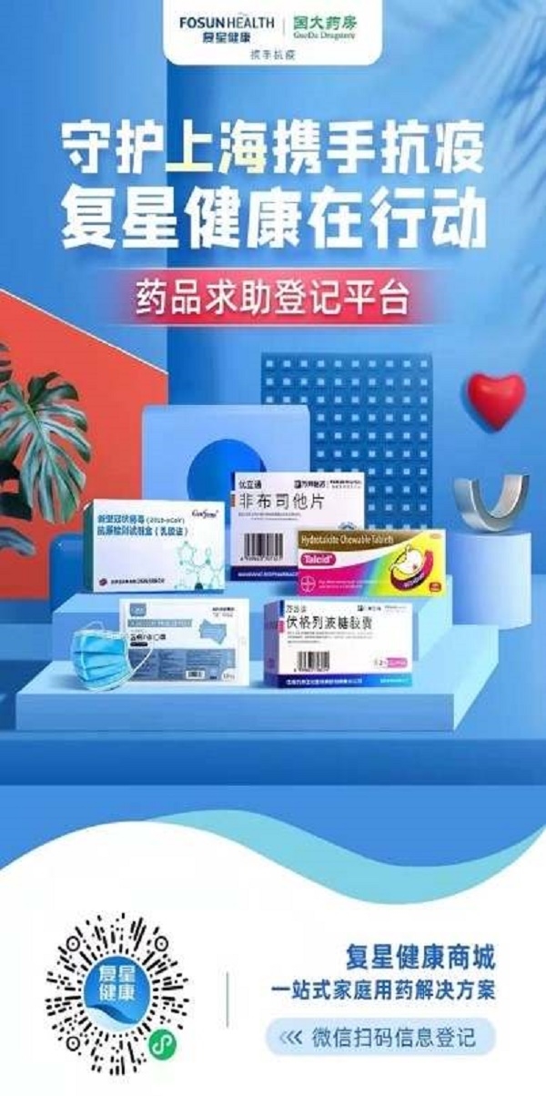 4月6日,复星健康携手国大药房上线“药品求助登记平台”,在严格遵守各地防疫措施的前提下,协调、安排推进履约服务,努力缓解上海居民居家配药压力,提供药品供应和用药服务。