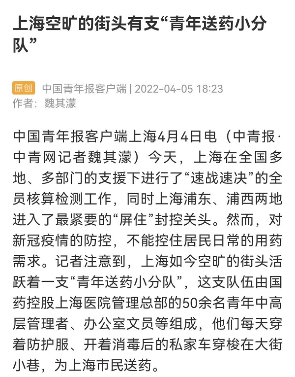 今天,上海在全国多地、多部门的支援下进行了“速战速决”的全员核酸检测工作,同时上海浦东、浦西两地进入了最紧要的“屏住”封控关头。然而,对新冠疫情的防控,不能控住居民日常的用药需求。记者注意到,上海如今空旷的街头活跃着一支“青年送药小分队”,这支队伍由国药控股上海医院管理总部的50余名青年中高层管理者、办公室文员等组成,他们每天穿着防护服、开着消毒后的私家车穿梭在大街小巷,为上海市民送药。