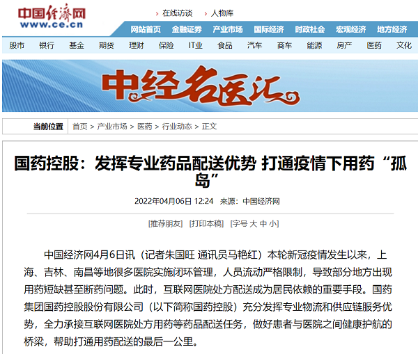 本轮新冠疫情发生后,上海、吉林、南昌等地很多医院实施闭环管理,人员流动严格限制,导致出现用药短缺甚至断药问题。此时,互联网医院处方配送,成为居民依赖的重要手段。国药控股充分发挥专业物流和供应链服务优势,全力承接互联网医院处方等药品配送任务,做好患者与医院之间健康护航的桥梁,帮助打通用药配送的最后一公里,全力打赢这场疫情防控阻击战。