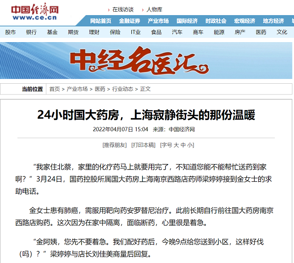 上海疫情发生后,国药控股国大药房为保证广大市民买到药品和防疫物资,200余家门店坚持营业,并且根据社区封闭管理规定,为居民建立了“网络订药、点对点免费送药”的服务模式,对不擅长使用智能手机的老人群体开通了电话服务送药。