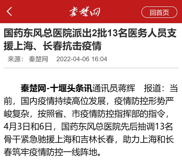 当前,国内疫情持续高位发展,疫情防控形势严峻复杂,按照省、市疫情防控指挥部的指令,4月3日和6日,国药东风总医院先后抽调13名骨干紧急驰援上海和吉林长春,助力上海和长春筑牢疫情防控一线阵地。