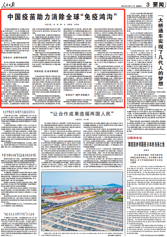 迄今为止,中国有3款新冠疫苗被世界卫生组织纳入紧急使用清单,超过100个国家批准使用中国生产的疫苗,其中许多国家把中国疫苗作为低龄儿童唯一使用的疫苗。中国新冠疫苗持续为全球抗疫作出积极贡献,助力消除“免疫鸿沟”。
