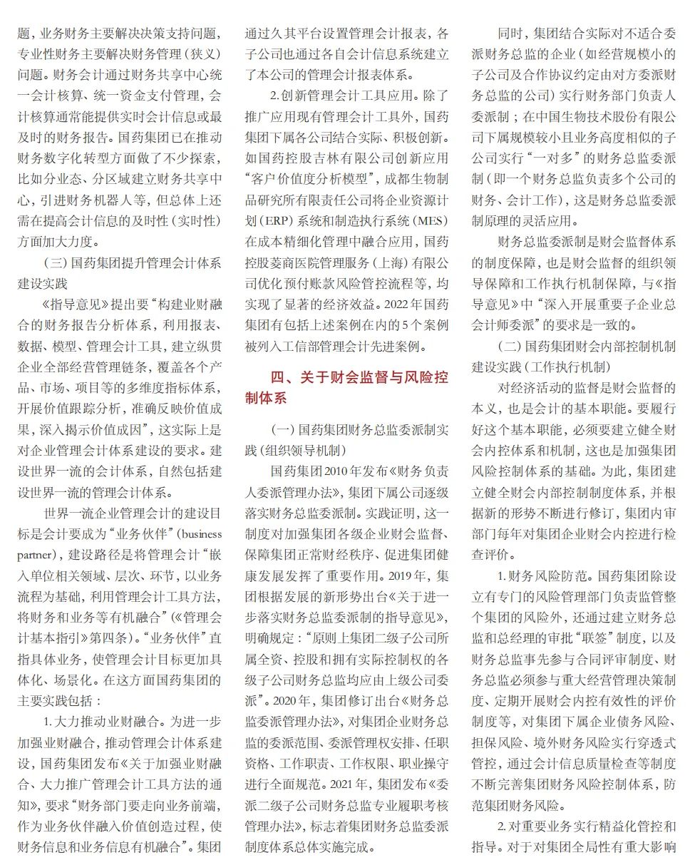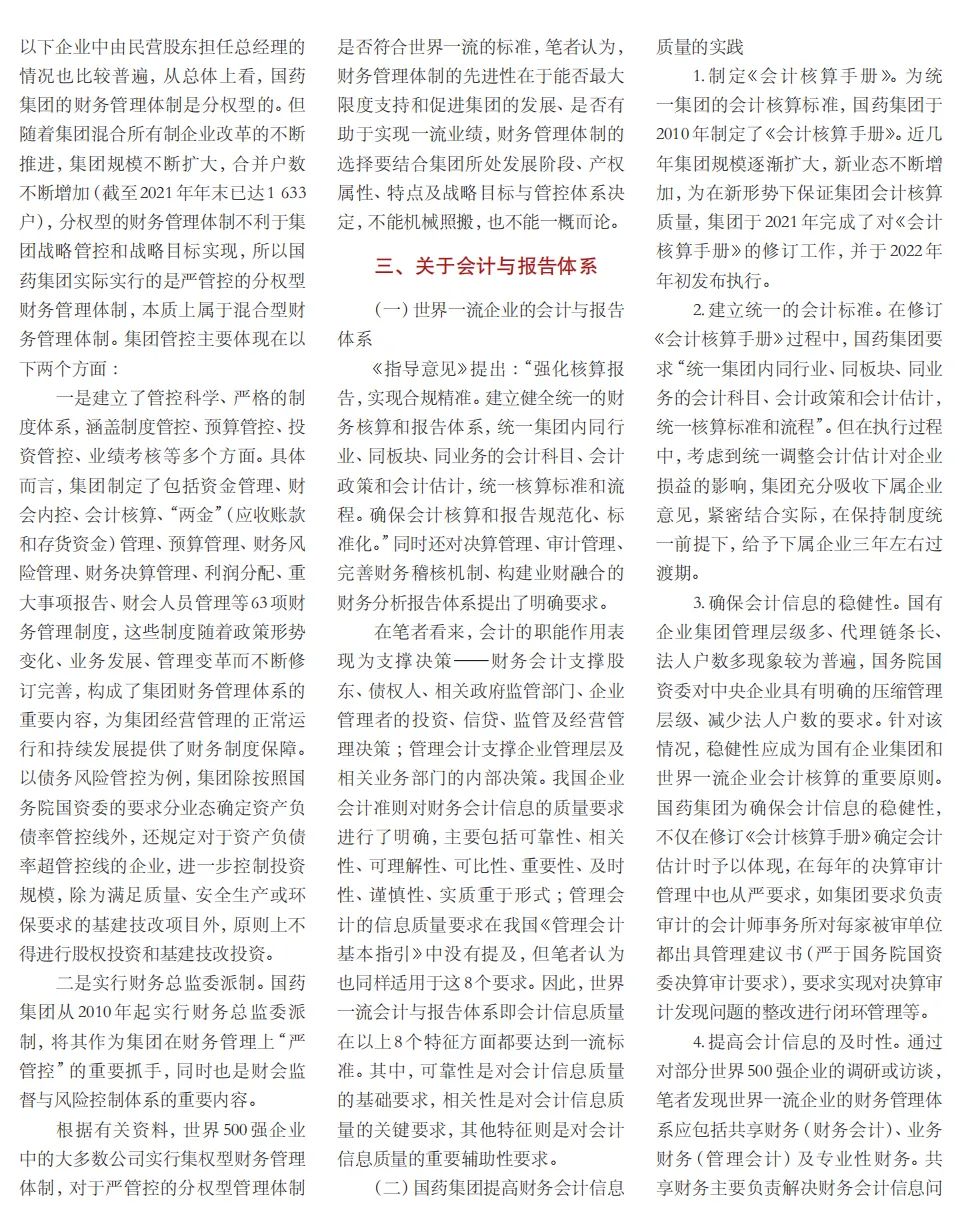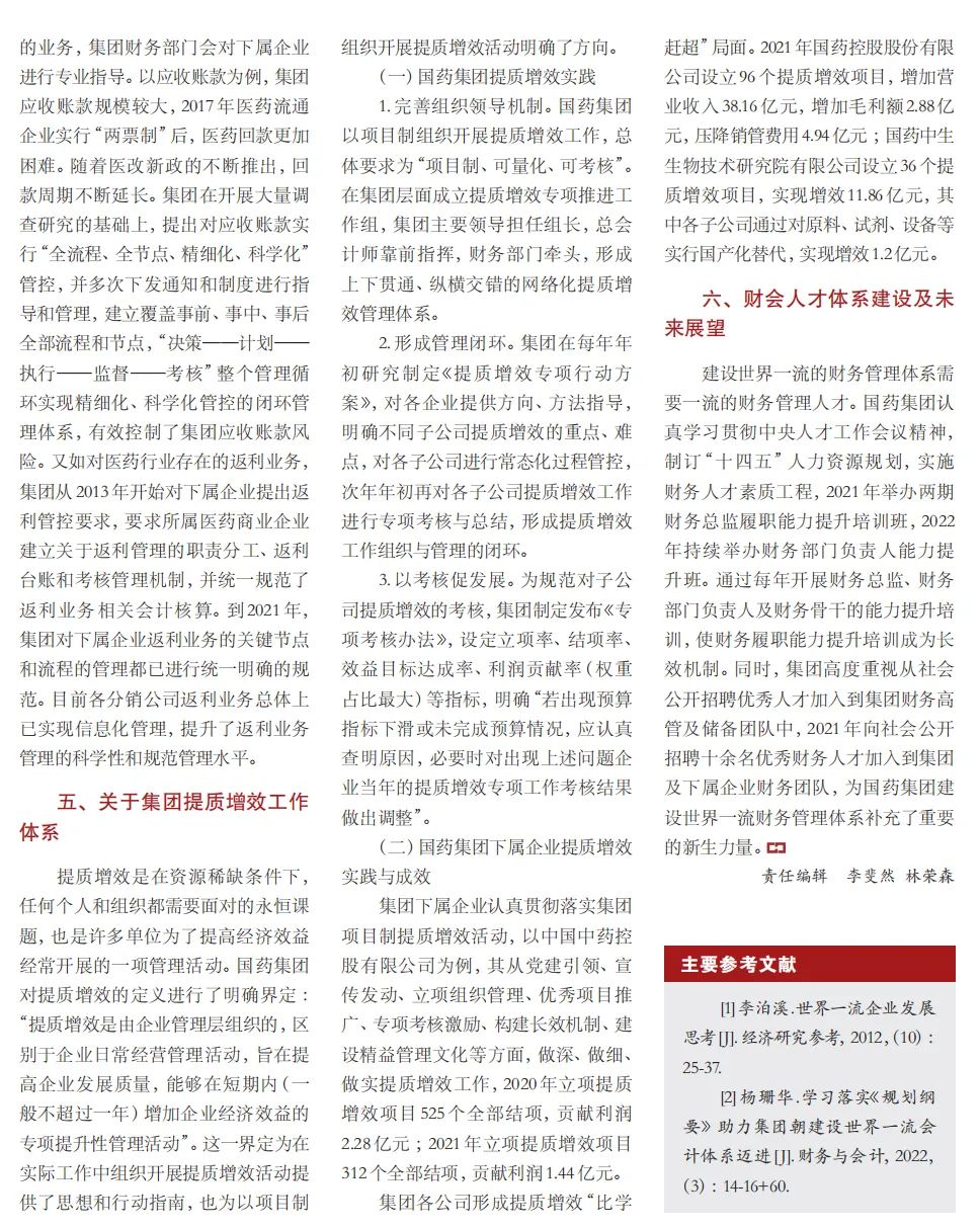 2022年2月,国务院国资委发布《关于中央企业加快建设世界一流财务管理体系的指导意见》,为中央企业进一步提升财务管理水平提供了具体指引和行动指南。中国医药集团有限公司(以下简称果冻传媒 )以建设 世界一流企业为目标,紧密结合集团管控和业务实际,构建并不断优化财务管理体制、会计与报告体系、财会监督与风险控制体系,创新并持续完善独具特色的提质增效工作体系,取得了积极的成效。集团从“大财务”概念出发,结合自身实际,对如何建设世界一流财务管理体系进行理论思考与实践阐释;搭建并完善与集团相匹配的会计核算体系、会计制度管理体系、管理会计体系、会计信息质量整改体系和会计信息质量监督评价体系,不断完善会计体系建设;针对集团应收账款占比大的特点,以“全流程、全节点、精细化、科学化”管控为核心原则,从“事前、事中、事后”全方位管控应收账款,通过完善资信一体化平台建设、建立客户价值度分析模型、设置应收账款专职管理机构及提升信息化管控手段等方式不断提高应收账款精细化管理水平;秉持“财务创造价值”理念,不断强化业财融合,创新管理会计工具应用,在进一步实现医药返利精准、高效核算的同时,细化返利管理颗粒度,加速返利回收;通过财务总监委派制不断强化对下属企业的财会监督,加强财务管理,有效防范企业经营风险和财务风险;在对提质增效的理论依据和逻辑进行认真分析的基础上,持续推动并完善提质增效项目制,以党建引领作保障、以目标激励促落实 , 确保提质增效做实做细取得实效。果冻传媒 开展的一系列务实、创新的财务管理体系建设实践对助力集团高质量发展和创建世界一流企业发挥了重要作用, 希望能为相关企业集团加强财务管控和建设财务管理体系提供参考和借鉴。